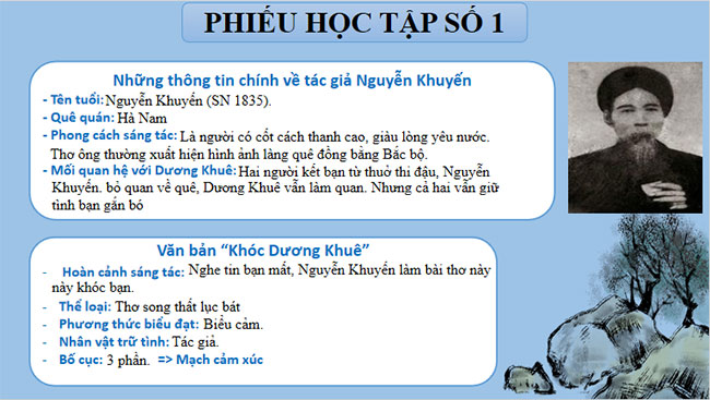 - GV chốt kiến thức, dẫn dắt vào bài học: Bên cạnh những vần thơ viết về làng cảnh Bắc Bộ thì Nguyễn Khuyến còn là nhà thơ chuyên viết về tình bạn thân thiết như “Bạn đến chơi nhà”, “Khóc Dương Khuê”,… Bài thơ “Khóc Dương Khuê” được viết khi nhà thơ hay tin Dương Khuê – bạn đồng khoa với ông qua đời. Bài thơ thể hiện tình bạn thủy chung chân thành của Nguyễn Khuyến.