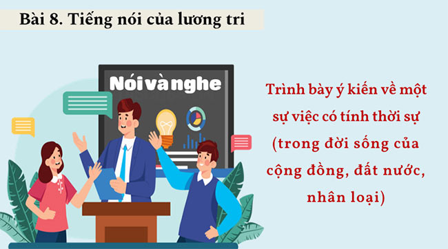 - Biết biết trình bày ý kiến, khẳng định và bảo vệ ý kiến về một sự việc có tính thời sự trong đời sống của cộng đồng, đất nước, nhân loại.