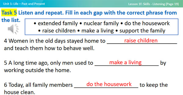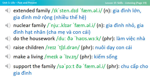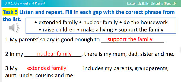 - enrich vocabulary about family life: extended family, nuclear family, do the housework, raise children, make a living, support the family.