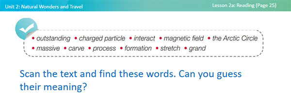 - talk about a natural wonder in their country using the vocabulary: outstanding, charged particle, interact, magnetic field, the Arctic Circle, massive, carve, process, formation, stretch, grand.