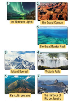 Suggested Answer Key: the Northern Lights, the Grand Canyon, Mount Everest, Victoria Falls, the Great Barrier Reef, Parícutin Volcano, the Harbour of Rio de Janeiro |