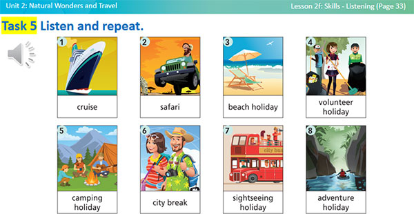 - enrich vocabulary about types of holidays: cruise, safari, beach holiday, volunteer holiday, camping holiday, city break, sightseeing holiday, adventure holiday.