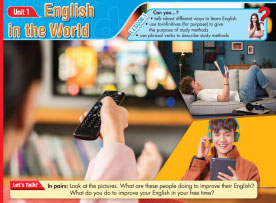 Let’s talk: Look at the title of the unit and the picture. What are these people doing to improve their English? What do you do to improve your English in your free time?