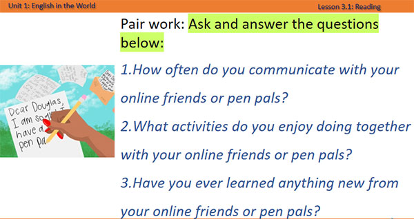 Pair work: Ask and answer the questions below: 1. How often do you communicate with your online friends or pen pals? 2. What activities do you enjoy doing together with your online friends or pen pals? 3. Have you ever learned anything new from your online friends or pen pals? - Ask Ss to work in pairs, and ask and answer the questions (using the DCR/ PPTs slides). - Call some pairs to give their answers. - Give feedback. |