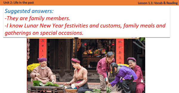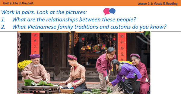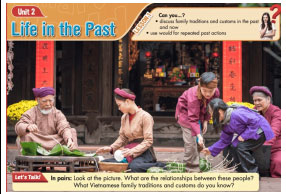 Let’s talk: Look at the title of the unit and the picture. Answer these questions: What are the relationships between these people? What Vietnamese family traditions and customs do you know?