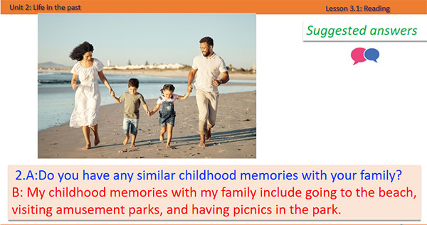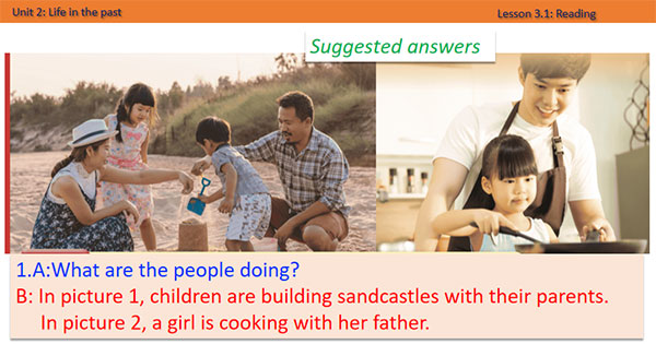 Suggested answers 1. What are the people doing? In picture 1, children are building sandcastles with their parents. In picture 2, a girl is cooking with her father. 2. Do you have any similar childhood memories with your family? My childhood memories with my family include going to the beach, visiting amusement parks, and having picnics in the park. |