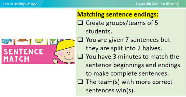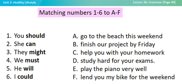 -Matching sentence endings: 1. Create groups/teams of 5 students. 2. You are given 7 sentences but they are split into 2 halves. 3. You have 3 minutes to match the sentence beginnings and endings to make complete sentences. 4. The team(s) with more correct sentences win(s). Sentence beginnings and endings: 1. You should 2. She can 3. They might 4. We must 5. He will 6. I could A. go to the beach this weekend B. finish our project by Friday C. help you with your homework D. study hard for your exams. E. play the piano very well F. lend you my bike for the weekend