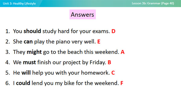 Suggested Answer Keys: 1. You should study hard for your exams. D 2. She can play the piano very well. E 3. They might go to the beach this weekend. A 4. We must finish our project by Friday. B 5. He will help you with your homework. C 6. I could lend you my bike for the weekend. F |