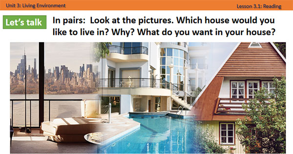 c. Expected outcomes: Ss can talk about the house they want to live in based on the title and the picture.
