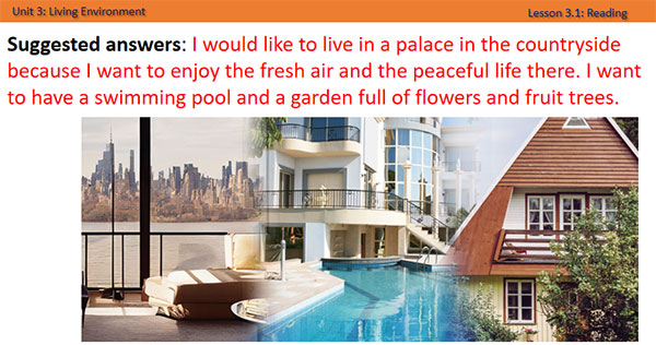 - Work in pairs, look at the title and the picture and answer the questions. - Share/exchange the answers with the class. Answer Keys I would like to live in a palace in the countryside because I want to enjoy the fresh air and the peaceful life there. I want to have a swimming pool and a garden full of flowers and fruit trees. Ss’ answers |
