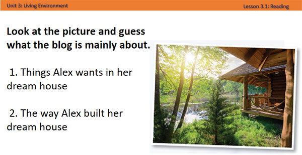 - Talk about the pictures. - Read a blog and choose the main idea. - Read and choose the correct answers. - Listen and read. - Say whether you would like to live in Alex's dream house (pair work). |