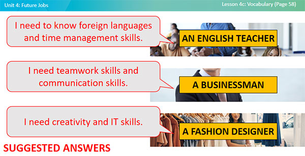 Answer key: 1. I need to know foreign languages and time management skills. 2. I need teamwork skills and communication skills. 3. I need creativity and IT skills. |