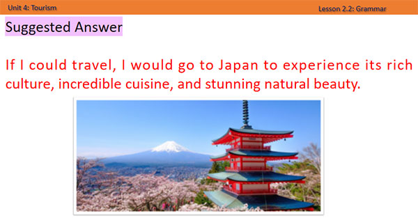 - Work in pair - Follow the instructions. - Ask and answer the question with others Suggested Answer If I could travel, I would go to Japan to experience its rich culture, incredible cuisine, and stunning natural beauty.
