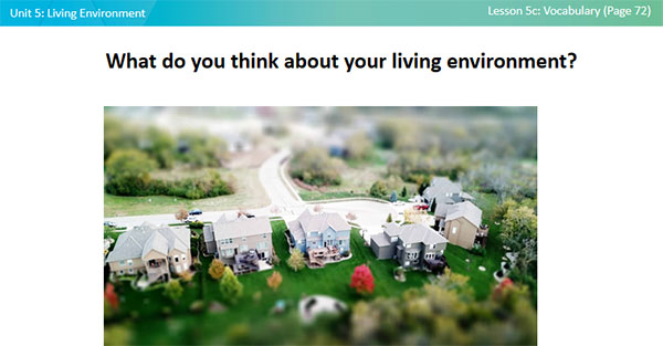 Talk about their holiday: - Ask students about their living environment: “How do you feel about your living environment?” - Elicit students’ ideas. |