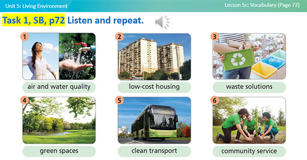 - enrich vocabulary and phrases about features of living environment: air and water quality, low-cost housing, waste solutions, green spaces, clean transport, community service.