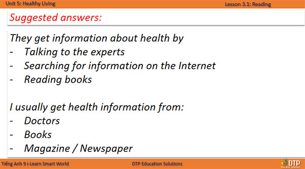 - Work in pairs, look at the pictures and answer the questions. - Share the answers with the class. Suggested answers: They get information about health by - Talking to the experts - Searching for information on the Internet - Reading books I usually get health information from: - Doctors - Books - Magazine / Newspaper Ss’ answers |