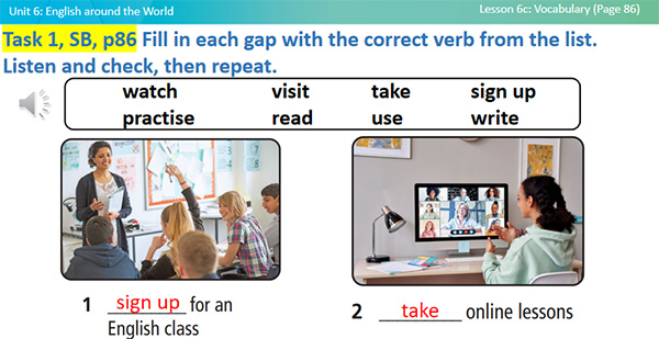 - enrich vocabulary and phrases about ways of learning English: sign up for an English class, take online lessons, watch English-language films, practise the language with English friends, use English learning apps, read English books, write blogs in English, visit an English-speaking country.