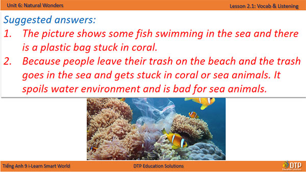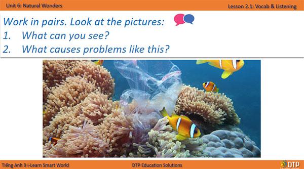 - Match the words with definitions. - Read some sentences and choose the correct words then fill in the blanks. - Listen and check. Listen again and repeat. - Listen to some teenagers talking about problems at some natural places then choose the correct words or phrases. - Practice conversation in groups of three. - In pairs: Talk about some good ideas to protect these natural places. |
