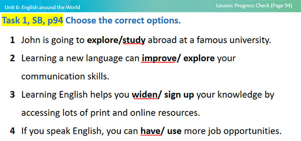 Task 1. Choose the correct options. - Check students’ answers and ask students to mark themselves. |
