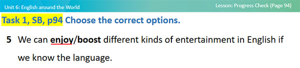 WE, p.113. Choose the correct options. - Give students time to complete the task. - Check students’ answers using IWB and ask students to mark themselves. |