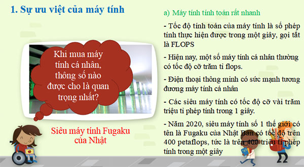 1. Sự ưu việt của máy tính a) Máy tính tính toán rất nhanh - Tốc độ tính toán của máy tính là số phép tính thực hiện được trong một giây, gọi tắt là FLOPS - Hiện nay, một số máy tính cá nhân thường có tốc độ cỡ trăm tỉ flops. - Điện thoại thông minh có sức mạnh tương đương máy tính cá nhân - Các siêu máy tính có tốc độ cỡ vài trăm triệu tỉ phép tính trong 1 giây. - Năm 2020, siêu máy tính số 1 thế giới có tên là Fugaku của Nhật Bản có tốc độ trên 400 petaflops, tức là trên 400 triệu tỉ phép tính trong một giây
