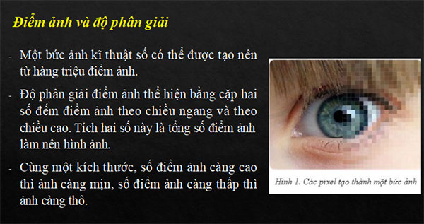 1. Số hóa hình ảnh a) Rời rạc hóa hình ảnh và các điểm ảnh - Người ta dùng lưới ô vuông để chia một hình ảnh thành nhiều ô vuông rất nhỏ, mỗi ô vuông gọi là một phẩn tử ảnh. - Hình ảnh gồm nhiều phần tử ảnh là các ô vuông rất nhỏ, xếp lần lượt từ trái sang phải, từ trên xuống dưới. Điểm ảnh và độ phân giải · Một bức ảnh kĩ thuật số có thể được tạo nên từ hàng triệu điểm ảnh. · Độ phân giải điểm ảnh thể hiện bằng cặp hai số đếm điểm ảnh theo chiều ngang và theo chiều cao. Tích hai số này là tổng số điểm ảnh làm nên hình ảnh. · Cùng một kích thước, số điểm ảnh càng cao thì ảnh càng mịn, số điểm ảnh càng thấp thì ảnh càng thô. b) Hệ màu và rời rạc hóa màu · Hệ màu RGB: R là Red (màu đỏ), G là Green (màu xanh lục), B là Blue (màu xanh lam) · Hệ màu RGB dành 1 byte để thể hiện cường độ của mỗi màu trong tổ hợp. Như vậy giá trị cường độ của mỗi màu biến thiên từ 0 đến 255. Một bộ ba byte sẽ thể hiện một cách tổ hợp ba màu cơ sở để nhận được một màu sắc cụ thể. · Hệ màu RGB có số lượng màu là 28 x 28 x 28 = 224 = 16 777 216 · Rời rạc màu: cho tương ứng mỗi màu với một dãy bit nhất định gọi là mã nhị phân của màu. Màu khác nhau thì mã nhị phân khác nhau. · Độ sâu màu: độ dài dãy bit để rời rạc hóa màu. c) Số hóa hình ảnh · Theo định nghĩa, mỗi điểm ảnh có diện tích rất nhỏ. · Coi mỗi điểm ảnh là một ô vuông đồng màu (một màu đồng nhất) - Sau khi rời rạc hóa hình ảnh, sắp xếp mã nhị phân màu của các điểm ảnh nối tiếp nhau từ trái sang phải, từ trên xuống dưới, ta sẽ nhận được dãy bit biểu diễn ảnh số |