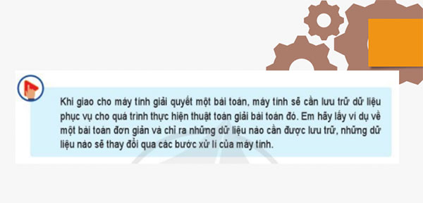 ? Khi giao cho máy tính iaỉ quyết một bài toán, máy tính sẽ cần lưu trữ dữ liệu phục vụ cho quá trình thực hiện thuật toán giải bài toán đó. Em hãy lấy ví dụ về một bài toán đơn giản và chỉ ra những dữ liệu nào cần được lưu trữ, những dữ liệu nào sẽ thay đổi qua các bước xử lí của máy tính?