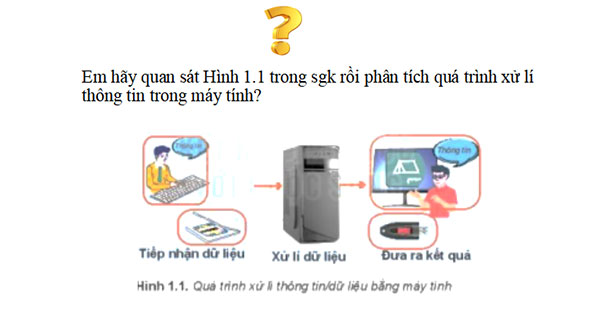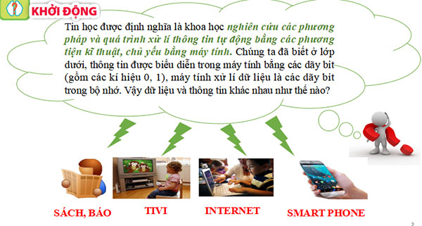 Tin học được định nghĩa là khoa học nghiên cứu các phương pháp và quá trình xử lí thông tin tự động bằng các phương tiện kĩ thuật, chủ yếu bằng máy tính. Chúng ta đã biết ở lớp dưới, thông tin được biểu diễn trong máy tính bằng các dãy bit (gồm các kí hiệu 0, 1), máy tính xử lí dữ liệu là các dãy bit trong bộ nhớ. Vậy dữ liệu và thông tin khác nhau như thế nào?