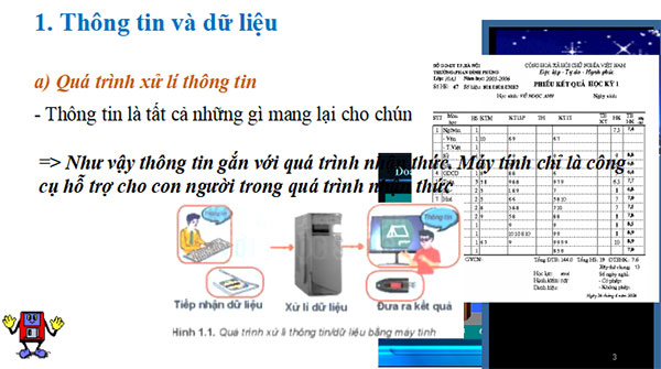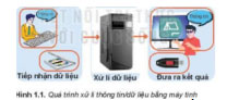 - Quá trình xử lí thông tin của máy tính gồm các bước sau: + Bước 1. Tiếp nhận dữ liệu: Máy tính tiếp nhận dữ liệu thường theo hai cách: - Cách 1. Từ thiết bị - Cách 2. Từ bàn phím do con người nhập + Bước 2. Xử lí dữ liệu: Biến đổi dữ liệu trong bộ nhớ máy tính để tạo ra dữ liệu mới. + Bước 3. Đưa ra kết quả: Máy tính có thể đưa ra kết quả theo hai cách: - Cách 1. Dữ liệu được thể hiện dưới dạng văn bản, âm thanh, hình ảnh,… mà con người có thể hiểu được. Như vậy dữ liệu đã được chuyển thành thông tin. - Cách 2. Lưu dữ liệu lên một vật mang tin như thẻ nhớ hoặc chuyển thành dữ liệu đầu vào cho một hoạt động xử lí khác. b) Phân biệt dữ liệu và thông tin Thông tin và dữ liệu độc lập tương đối với nhau: - Có thể có nhiều loại dữ liệu khác nhau của một thông tin, bài ghi trong vở của trò, tệp bài soạn của cô hay video ghi lại tiết giảng đều là dữ liệu của một bài giảng. - Nếu dữ liệu không đầy đủ thì không xác định được chính xác thông tin. Ví dụ: dữ liệu “39o C” trong một bộ dữ liệu về thời tiết mang thông tin “trời rất nóng” nhưng dữ liệu “39o C” trong bộ dữ liệu bệnh án lại mang thông tin “sốt cao”. ⇨ Như vậy, thông tin có tính toàn vẹn, được hiểu đúng khi có đầy đủ dữ liệu, nếu thiếu dữ liệu thì có thể làm thông tin bị sai hoặc không xác định được. - Với cùng một bộ dữ liệu, cách xử lí khác nhau có thể đem lại những thông tin khác nhau. Ví dụ: dữ liệu thời tiết một ngày nào đó có thể được tổng hợp theo vùng để biết phân bố lượng mưa trong ngày, nhưng cũng có thể xử lí để cho dự báo thời tiết ngày hôm sau. - Việc xử lí các bộ dữ liệu khác nhau cũng có thể đưa đến cùng một thông tin. Ví dụ, xử lí dữ liệu về băng tan ở Bắc Cực hay cường độ bão ở vùng nhiệt đới đều có thể dẫn đến kết luận về sự nóng lên của Trái Đất. Kết luận: ⇨ Trong máy tính, dữ liệu là thông tin đã được đưa vào máy tính để máy tính có thể nhận biết và xử lí được. ⇨ Thông tin là ý nghĩa của dữ liệu, Dữ liệu là các yếu tố thể hiện, xác định thông tin. Thông tin và dữ liệu có tính độc lập tương đối. Cùng một thông tin có thể được thể hiện bởi nhiều loại dữ liệu khác nhau. Ngược lại, một dữ liệu có thể mang nhiều thông tin khác nhau. ⇨ Với vai trò là ý nghĩa, thông tin có tính toàn vẹn. Dữ liệu không đầy đủ có thể làm thông tin sai lệch, thậm chí không xác định được. |