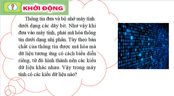 Thông tin đưa và bộ nhớ máy tính dưới dạng các dãy bit. Như vậy khi đưa vào máy tính, phải mã hóa thông tin dưới dạng nhị phân. Tùy theo bản chất của thông tin được mã hóa mà dữ liệu tương ứng có cách biểu diễn riêng, từ đó hình thành nên các kiểu dữ liệu khác nhau. Vậy trong máy tính có các kiểu dữ liệu nào?