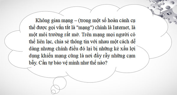 Không gian mạng – (trong một số hoàn cảnh cụ thể được gọi vắn tắt là "mạng") chính là Internet, là một môi trường rất mở. Trên mạng mọi người có thể liên lạc, chia sẻ thông tin với nhau một cách dễ dàng nhưng chính điều đó lại bị những kẻ xấu lợi dụng khiến mạng cũng là nơi đầy rẫy những cạm bẫy. Cần tự bảo vệ mình như thế nào?