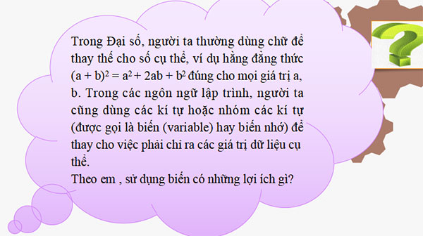 - Trong Đại số, người ta thường dùng chữ để thay thế cho số cụ thể, ví dụ hằng đẳng thức (a + b)2 = a2 + 2ab + b2 đúng cho mọi giá trị a, b. Trong các ngôn ngữ lập trình, người ta cũng dùng các kí tự hoặc nhóm các kí tự (được gọi là biến (variable) hay biến nhớ) để thay cho việc phải chỉ ra các giá trị dữ liệu cụ thể.