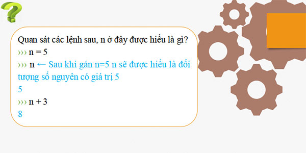 * Bước 1: Chuyển giao nhiệm vụ: GV: Nêu đặt câu hỏi Quan sát các lệnh sau, n ở đây được hiểu là gì? ››› n = 5 ››› n ← Sau khi gán n=5 n sẽ được hiểu là đối tượng số nguyên có giá trị 5 5 ››› n + 3 8