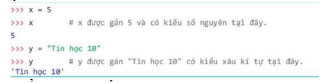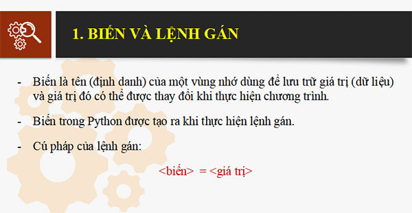 1. BIẾN VÀ LỆNH GÁN - Biến là tên (định danh) của một vùng nhớ dùng để lưu trữ giá trị (dữ liệu) và giá trị đó có thể được thay đổi khi thực hiện chương trình. - Biến trong Python được tạo ra khi thực hiện lệnh gán. - Cú pháp của lệnh gán: <biến> = <giá trị> - Khi thực hiện lệnh gán, <giá trị> bên phải sẽ được gán cho <biến>. Nếu biến chưa được khai báo thì nó sẽ được khởi tạo khi thực hiện câu lệnh gán. - Biến trong Python được xác định kiểu dữ liệu tại thời điểm gán giá trị nên không cần khai báo trước kiểu dữ liệu cho biến. Ví dụ:
