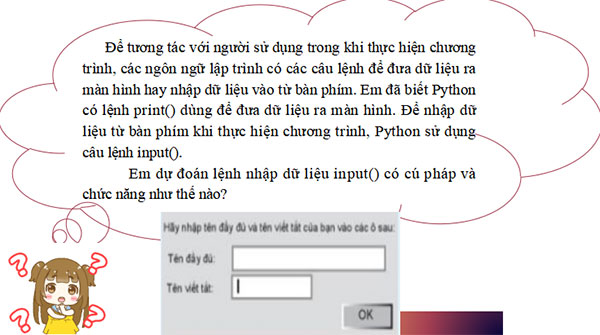 Để tương tác với người sử dụng trong khi thực hiện chương trình, các ngôn ngữ lập trình có các câu lệnh để đưa dữ liệu ra màn hình hay nhập dữ liệu vào từ bàn phím. Em đã biết Python ccó lệnh print( ) dùng để đưa dữ liệu ra màn hình. Để nhập dữ liệu từ bàn phím khi thực hiện chương trình, Python sử dụng câu lệnh input( ).