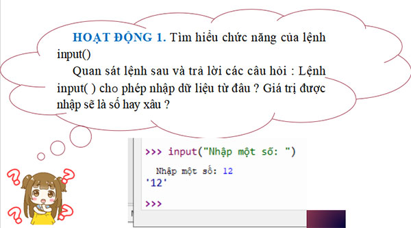 - Lệnh input( ) có chức năng nhập dữ liệu từ thiết bị vào chuẩn (thường là bàn phím). Nội dung nhập có thể là số, biểu thức hay xâu và cho kết quả là một xâu kí tự.