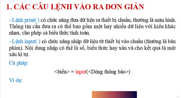 - Các lệnh vào ra đơn giản của Python bao gồm lệnh input( ) và lệnh print( )
