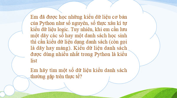 Em đã được học những kiểu dữ liệu cơ bản của Python như số nguyên, số thực xâu kí tự kiểu dữ liệu logic. Tuy nhiên, khi em cần lưu một dãy các số hay một danh sách học sinh thì cần kiểu dữ liệu dạng danh sách (còn gọi là dãy hay mảng). Kiểu dữ liệu danh sách được dùng nhiều nhất trong Python là kiểu list