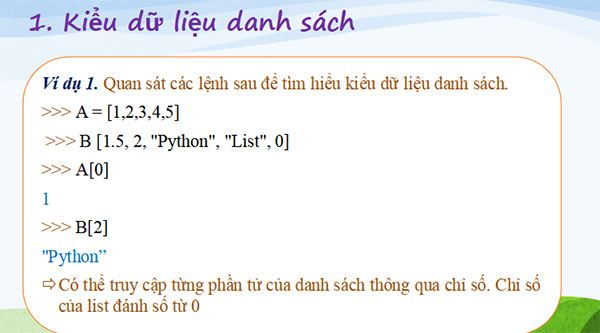 1. KIỂU DỮ LIỆU DANH SÁCH Ví dụ 1. Quan sát các lệnh sau để tìm hiểu kiểu dữ liệu danh sách. >>> A = [1,2,3,4,5] >>> B [1.5, 2, "Python", "List", 0] >>> A[0] 1 >>> B[2] "Python” ⇨ Có thể truy cập từng phần tử của danh sách thông qua chỉ số. Chỉ số của list đánh số từ 0