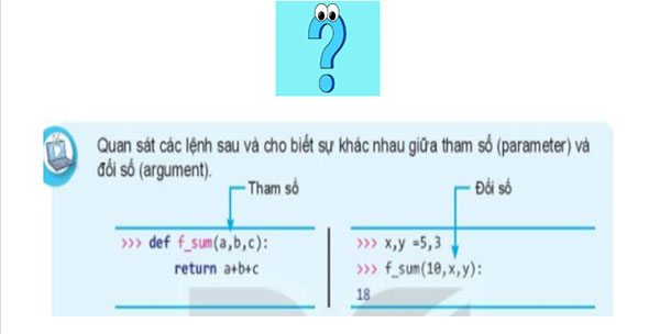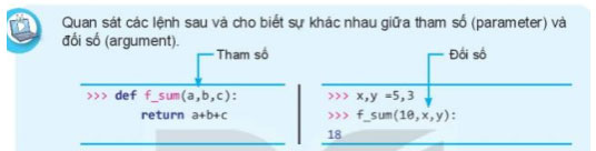 Ghi nhớ: Tham số của hàm được định nghĩa khi khai báo hàm và được dùng như biến trong định nghĩa hàm. Đối số là giá trị được truyền vào khi gọi hàm. Khi gọi hàm, các tham số (parameter) sẽ được truyền bằng giá trị thông qua đối số (argument) của hàm, số lượng giá trị được truyền vào hàm bằng với số tham số trong khai báo của hàm.