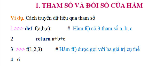 1 >>> def f(a,b,c): # Hàm f() có 3 tham số a, b, c