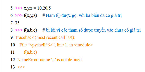 8 >>> f(a,b,c) # Lời gọi hàm bị lỗi nếu các tham số được truyền vào chưa có giá trị