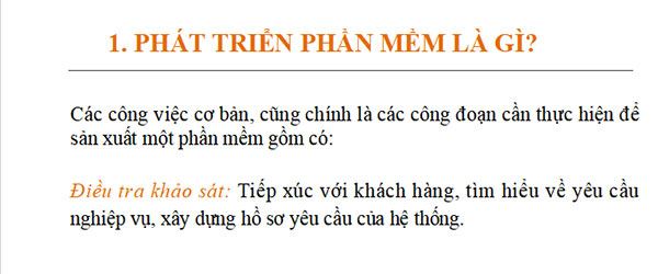1. PHÁT TRIỂN PHẦN MỀM LÀ GÌ? Các công việc cơ bản, cũng chính là các công đoạn cần thực hiện để sản xuất một phần mềm gồm có: Điều tra khảo sát: Tiếp xúc với khách hàng, tìm hiểu về yêu cầu nghiệp vụ, xây dựng hồ sơ yêu cầu của hệ thống. Phân tích hệ thống: Dựa trên các tài liệu điều tra khảo sát, chuyên viên phân tích sẽ tạo ra tài liệu mô tả đầy đủ yêu cầu của phần mềm. Thiết kế hệ thống: Dựa vào tài liệu phân tích, chuyên viên thiết kế sẽ đưa ra thiết kế tổng thể, thiết kế dữ liệu và thiết kế chức năng và có thể cả giao diện chi tiết. Lập trình: Dựa vào tài liệu thiết kế, các lập trình viên sẽ tiến hành tạo cơ sở dữ liệu nếu cần và viết các đoạn mã thực hiện các chức năng. Kiểm thử: Phát hiện để loại bỏ các lỗi cũng như các bất hợp lí trong sử dụng chương trình nếu có; kiểm tra kết quả thực hiện theo chức năng đã thiết kế,… Chuyển giao: Cài đặt, khởi tạo dữ liệu, hướng dẫn sử dụng và chuyển giao. Bảo trì: nhằm khắc phục triệt để các lỗi, nâng cấp cả về tính năng và giao diện của phần mềm. Công việc này có thể là một vòng phát triển mới, liên quan tới tất cả các công việc sản xuất phần mềm nêu trên. Hoạt động có tính bao trùm lên toàn bộ các công việc cơ bản của sản xuất phần mềm là quản trị dự án phần mềm, bao gồm lập kế hoạch, điều phối nhân sự, tài chính, phương tiện, kiểm soát chất lượng, để đảm bảo thành công của dự án. Tất cả các công việc và hoạt động nêu trên được gọi chung là phát triển phần mềm mà lập trình chỉ là một hoạt động trong đó. Những người tham gia vào các công việc và hoạt động đó đều được gọi là người phát triển phần mềm (Software Developer). Tóm lại Phát triển phần mềm gồm các công việc và hoạt động sau: điều tra, khảo sát, phân tích và thiết kế hệ thống; lập trình; kiểm thử; chuyển giao; bảo trì và quản trị dự án. |