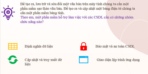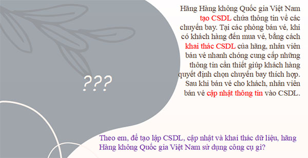 - GV dẫn dắt: Một cơ sở dữ liệu lưu dữ liệu trên hệ thống máy tính dưới dạng các tệp có cấu trúc được thiết kế để nhiều người dùng có thể cùng khai thác dữ liệu trong cơ sở dữ liệu đó. Tuy nhiên không phải tất cả người dùng đều biết về cấu trúc các tệp lưu dữ liệu và tự viết chương trình khai thác dữ liệu. Theo em có thể giải quyết vấn đề này như thế nào?