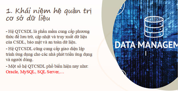 1. Khái niệm hệ quản trị cơ sở dữ liệu - Hệ quản trị cơ sở dữ liệu là phần mềm cung cấp phương thức để lưu trữ, cập nhật và truy xuất dữ liệu của cơ sở dữ liệu bảo mật và an toàn dữ liệu. - Hệ quản trị cơ sở dữ liệu cũng cung cấp giao diện lập trình ứng dụng do các nhà phát triển ứng dụng và người dùng. - Hệ quản trị cơ sở dữ liệu có các nhóm chức năng sau: + Nhóm chức năng định nghĩa dữ liệu . + Nhóm chức năng cập nhật và truy xuất dữ liệu . + Nhóm chức năng bảo mật an toán CSDL + Nhóm chức năng giao diện lập trình ứng dụng. |