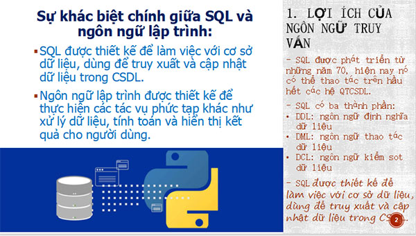 - Từ kết quả HĐ1, GV trình bày Sự khác biệt cơ bản trong các truy vấn nhờ ngôn ngữ truy vấn so với lập trình trực tiếp.