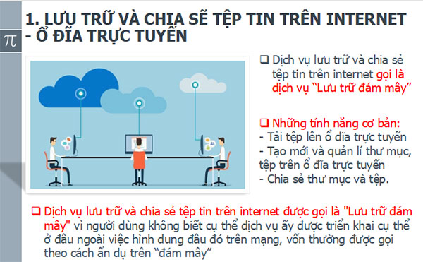 1. Lưu trữ và chia sẻ tệp tin trên Internet - ổ đĩa trực tuyến - Sử dụng dịch vụ lưu trữ thư mục và tệp trực tuyến, người dùng sẽ được cung cấp một ổ đĩa trực tuyến. - Trên ổ đĩa trực tuyến, người dùng có thể thực hiện phải tệp, thư mục lên để lưu trữ, tạo mới, chia sẻ tệp, thư mục… và các tính năng hữu ích khác |