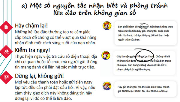 1. Nhận biết và phòng tránh một số dạng lừa đảo trên không gian số a. Một số nguyên tắc nhận biết và phòng tránh lừa đảo trong không gian số. Cần tỉnh táo, bình tĩnh tuân thủ ba nguyên tắc để nhận biết và phòng tránh lừa đảo trong không gian số: - Hãy chậm lại! - Kiểm tra ngay! - Dừng lại, không gửi! |