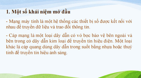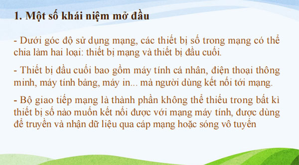 HS biết được các khái niệm mạng máy tính, cáp mạng, thiết bị đầu cuối, bộ giao tiếp mạng