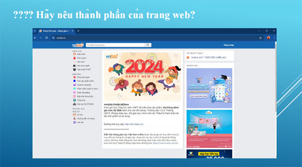 - GV nhận xét, chuẩn hóa kiến thức cho học sinh. Trang web tĩnh là trang web sử dụng hoàn toàn ngôn ngữ HTML, sau khi tải trang HTML từ máy chủ xuống, trình duyệt sẽ biên dịch mã và hiển thị nội dung trang web, người dùng hầu như không thể tương tác với trang web. Trang Web động luôn luôn có thông tin mới do các thông tin này được cập nhật bởi phần mềm quản trị web do các công ty thiết kế website cung cấp. Các thông tin mới này được lưu vào cơ sở dữ liệu của website và đưa ra sử dụng dựa theo yêu cầu của người dùng. |